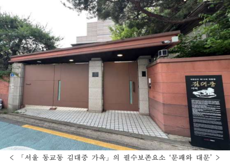 한편, 국가유산청은 「서울 동교동 김대중 가옥」의 문화유산적 가치를 보존하기 위하여 소유자의 동의를 얻어 ‘문패와 대문’과 사저동의 ‘2층 생활공간’을 필수보존요소로 지정하기로 하였다. ▲ 고(故) 김대중 전 대통령 부부의 이름이 함께 쓰여진 ‘문패와 대문’은 여성 지위 향상에 대한 대통령의 평소 철학을 알 수 있는 상징적 요소이고, ▲ 사저동의 ‘2층 생활공간’은 서재, 침실 등 대통령의 생전 생활모습을 잘 간직하고 있기 때문에 보존가치가 크다.