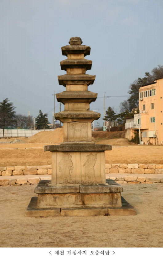 ㅇ 예천 개심사지 오층석탑은 1011년(고려, 현종 2년)에 건립된 고려시대 석탑으로 190자의 명문(銘文)이 있어 구체적인 건립시기와 과정, 당시 사회상 등을 알 수 있는 학술적 가치가 높고, 확실한 건립시기로 편년(編年) 기준이 되는 석탑이다. 탑은 2단의 기단부, 5층의 탑신부와 상륜부로 구성되어 있다.