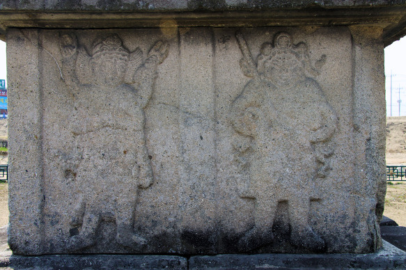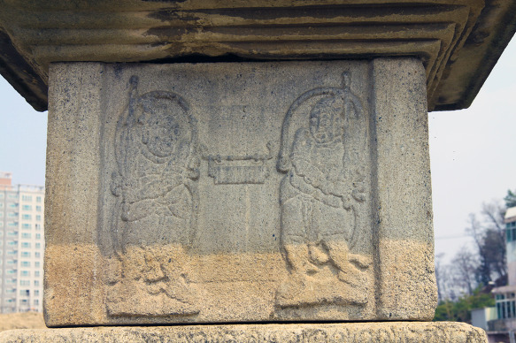 1층 몸돌에는 문고리 모양을 조각하고 그 좌우에 인왕상(仁王像)을 새겨 두었다.