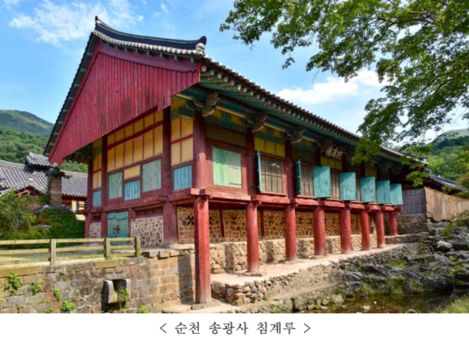 ㅇ 「순천 송광사 침계루」는 “신증동국여지승람”에 포은 이색(1328~1396)이 침계루를 제목으로 지은 시(詩)가 있어 14세기부터 있었던 것으로 추정되나, 현 건물은 “조계산송광사사고(曹溪山松廣寺史庫)”중수기를 통해 1668년(숙종 14) 혜문스님이 중건한 것으로 확인되며, 주요구조 목부재(평주, 대량, 중량, 종량 등)에 대한 연륜연대 조사결과에서도 1687년에 벌채된 목재임이 확인되어 역사적 가치가 크다.