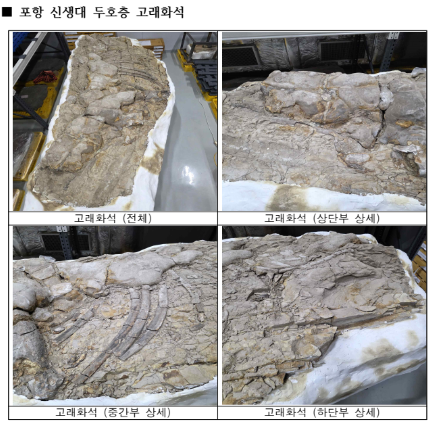 ㅇ 해당 고래 화석은 2008년 9월 포항시 장량택지개발지구에서 발견된 후 발굴되어 현재 천연기념물센터 수장고에 보관되어 있으며, 국내 신생대 고래화석 중 가장 큰 표본일 뿐 아니라 국내에서 처음 공개되는 수염고래아목(Mysticetes) 고래 화석으로 가치가 높음