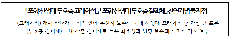 국가유산청은 높은 희소성과 미적 가치를 지닌 천연기념물 「포항 신생대 두호층 고래화석」,「포항 신생대 두호층 결핵체」가 포항 신생대 지질학적 역사를 이해하는 귀중한 자료로서 체계적으로 보존·활용될 수 있도록 노력할 것이다.