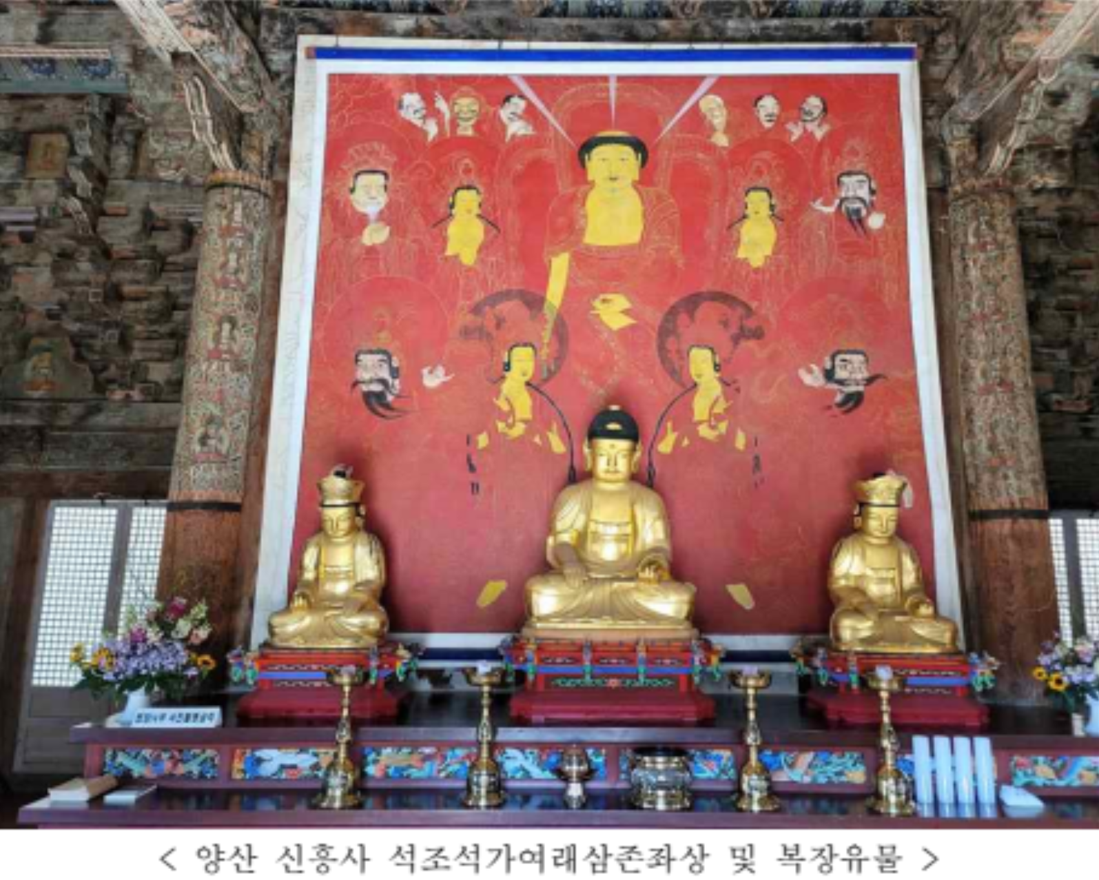「양산 신흥사 석조석가여래삼존좌상 및 복장유물」은 수조각승 승호(勝湖)를 비롯해 수연, 보장, 인원, 처행 등의 조각승들이 1682년(숙종 8년) 완성해 신흥사에 봉안한 작품이다. 이러한 제작 관련 정보들은 우협시(右脇侍) 보살좌상에서 발견된 조성 발원문을 통해 알 수 있는데, 발원문에는 이 불상이 ‘영산회(靈山會) 삼존’으로 조성되었다고 적혀있다. 17세기 이후 시왕상이나 나한상 등 수량이 많은 조각에 많이 사용되었던 재료인 불석(佛石, 제롤라이트)으로 제작되었다.