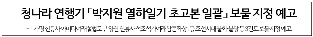 국가유산청(청장 허민)은 박지원이 조선 후기 청나라에 다녀온 후 작성한 견문록 「박지원 열하일기 초고본 일괄」을 비롯해 「가평 현등사 아미타여래설법도」, 「임실 진구사지 석조비로자나불좌상」, 「양산 신흥사 석조석가여래삼존좌상 및 복장유물」까지 총 4건을 국가지정문화유산 보물로 각각 지정 예고하였다.
