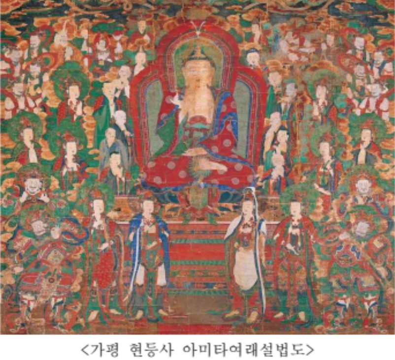 「가평 현등사 아미타여래설법도」는 화기(畵記)에 있는 기록을 통해 1759년(영조 35년)이라는 제작 연대, 오관(悟寬) 등의 제작자, 현등사라는 원봉안처 등을 명확히 알 수 있는 불화이다. 비단 바탕에 채색으로 아미타여래가 극락에서 여러 권속에게 설법하는 장면을 표현하였으며, 중앙에 크게 배치한 아미타여래를 중심으로 나한, 팔금강, 팔부중 등 권속(眷屬)들을 짜임새 있게 배치하였다. 존상(尊像)의 위계에 따라 채색과 크기를 달리 표현하고 주존(主尊)을 중심으로 좌우대칭을 이루게 배치하여 40여 존상이 함께 그려져 있는데도 안정적이다. 문양 등 세부 표현의 섬세한 처리, 깔끔하고 힘이 있는 필선 등을 통해 수화승(首畵僧) 오관의 뛰어난 역량을 짐작할 수 있다.