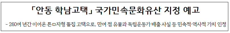 국가유산청은 「안동 학남고택」에 대해 30일간의 예고기간 동안 의견을 수렴한 후, 문화유산위원회의 심의를 거쳐 국가민속문화유산으로 지정 여부를 최종 결정할 예정이다. 이와 함께, 체계적인 보존·관리를 통해 역사문화관광자원으로 활용될 수 있도록 지자체와 협력해 나갈 것이다.