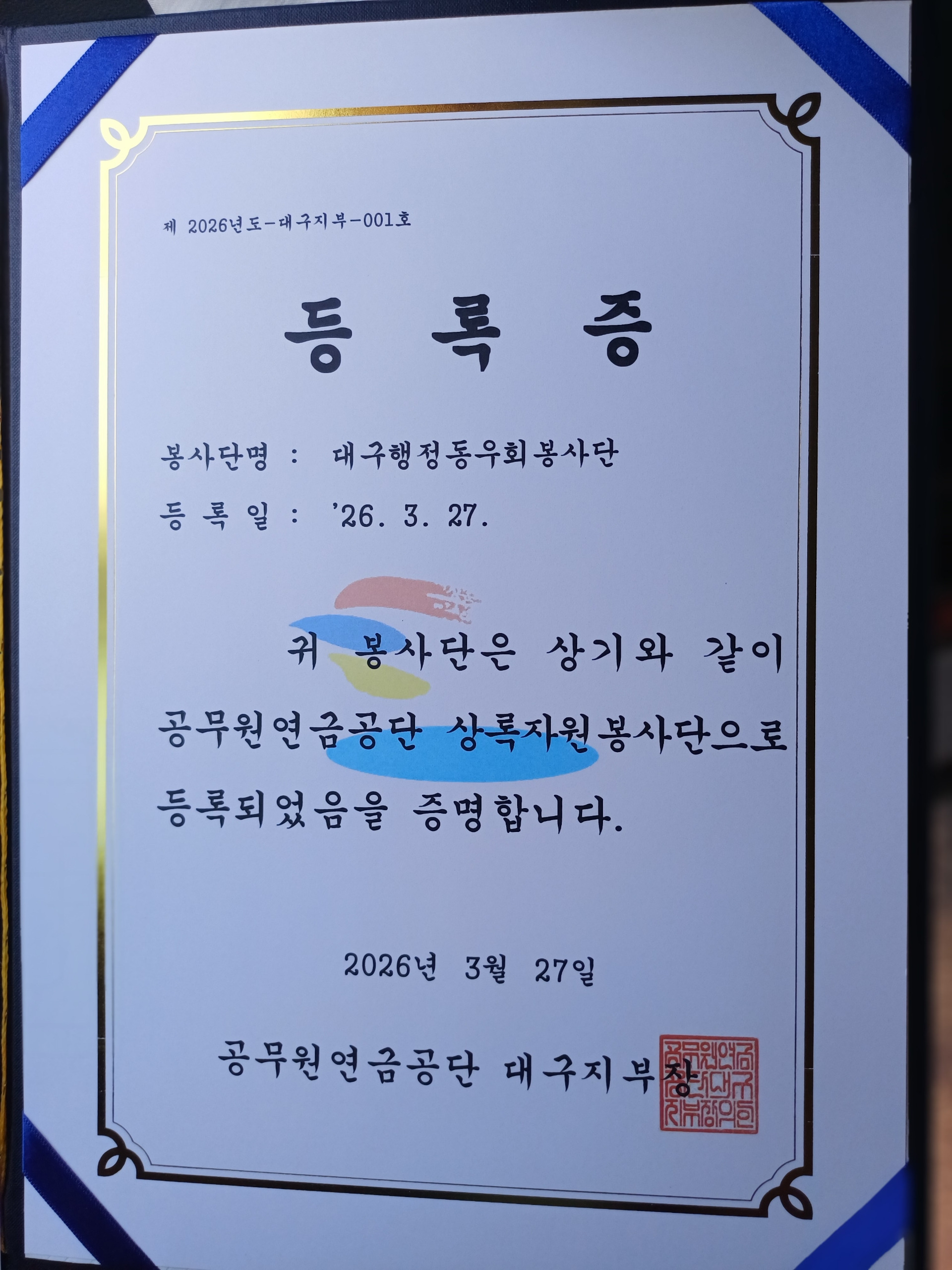 2026년 3월 27일(금), 대구중구노인복지회관에서 공무원연금공단 대구지부(지부장 박종무) 산하에 ‘대구행정동우회봉사단(단장 김득진)’이 공식 발대식이 성황리에 개최되었다.